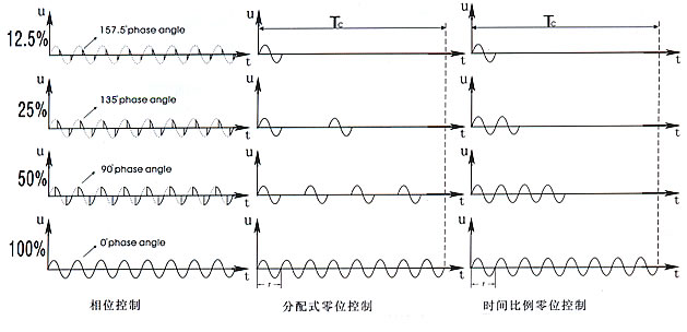 综观国内外可控硅电力控制器产品,控制模式无非就是两种:相位控制和零位控制(分配式零位控制、时间比例零控制)。三者之间的比较请看以下图表。